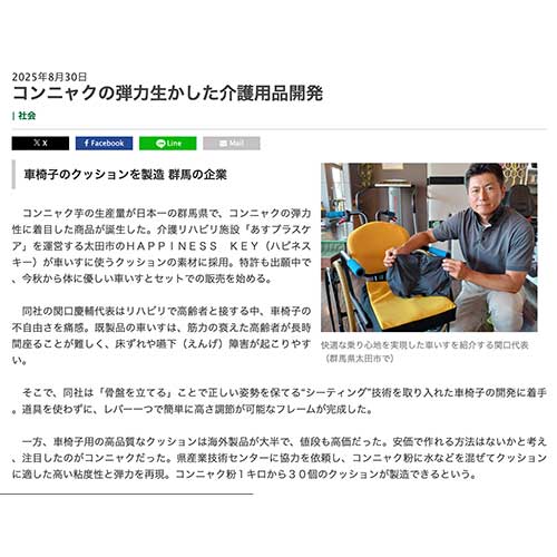 日本農業新聞に掲載されました「コンニャクの弾力生かした介護用品開発」 2025年8月30日 ハピネスキー株式会社の車いす開発が新聞に掲載されました。県産コンニャク粉の弾力を活かしたクッションを採用し、体に優しい座り心地を実現。特許出願中で、今秋より販売予定です。 記事はこちら